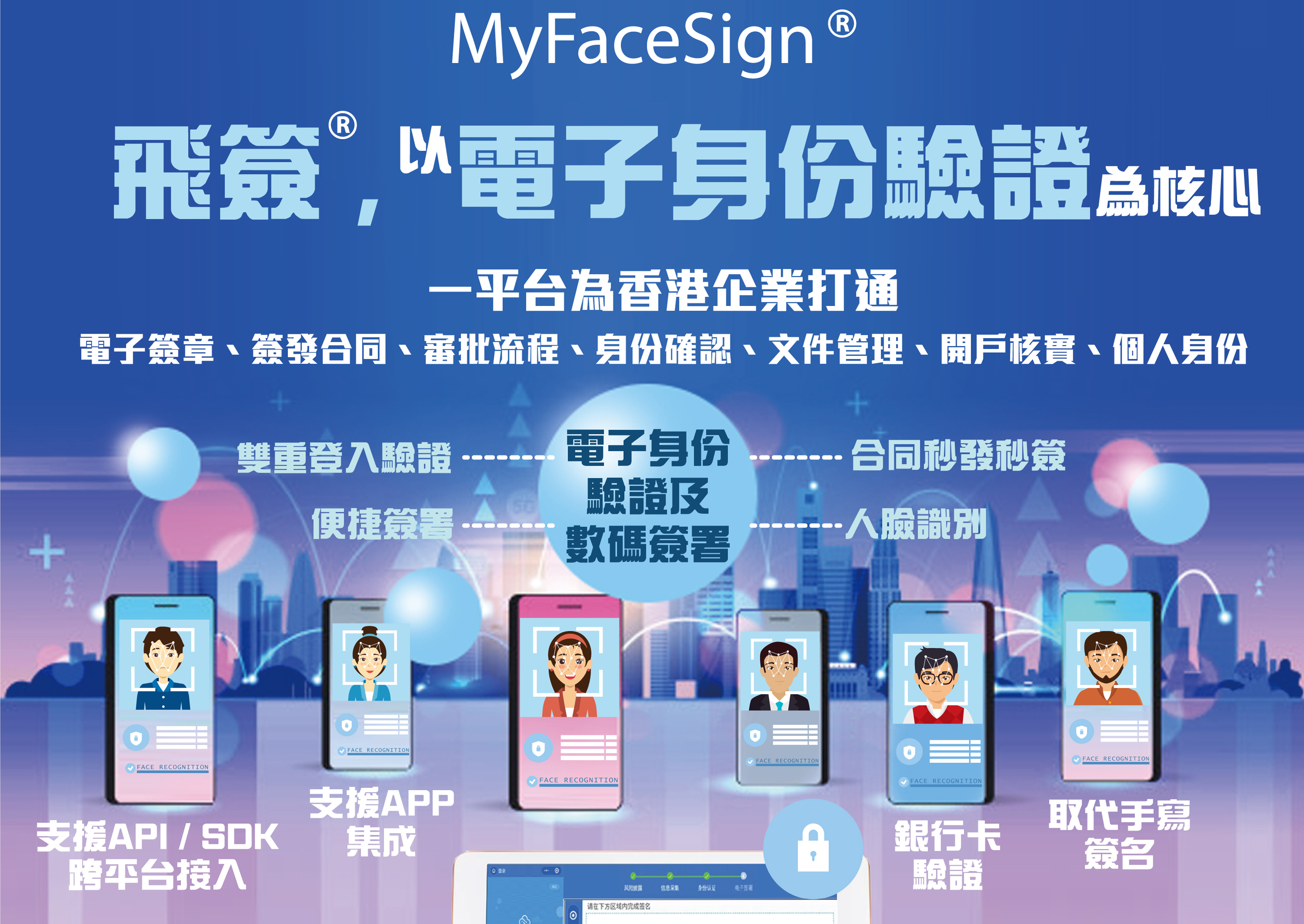 Certizen翘晋科技有限公司展示主研发的跨境电子合约签署平台,廣東省統一身份認證平台《飞签》,平台率先将大数据丶人工智能,区块链技术应用于数字身份领域,创新性融合国际 LEI 法人机构识别编码,以及香港為市民推行之“智方便”应用 ,提供个人与法人实名身份多维度认证渠道。《飞签》平台致力于解决跨境场景下各行业跨地域签约丶电子政务等问题, 构建智慧湾区可信认证标准体系,目前已集成「区块链可信认证服务」和「广东省统一身份认证平台」,确保了身份可验证,数据可追溯,信息防篡改和合法有效。